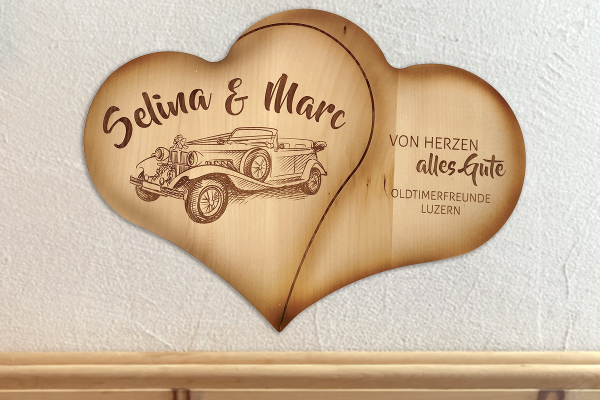 Das perfekte Geschenk für Brautpaare – ausreichend Platz für Logo, Bild und/oder Inschrift. Alternativ ist das Herz auch als Uhr erhältlich.