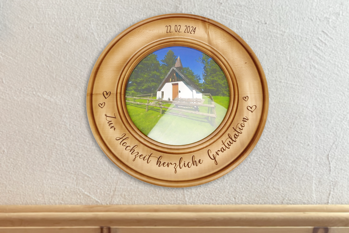 Bei diesem Teller kann ein Foto hinterlegt werden. Die Ausschnittgrösse hat einen Durchmesser von 170 mm. Die Inschrift findet Ihren Platz auf dem Rand.